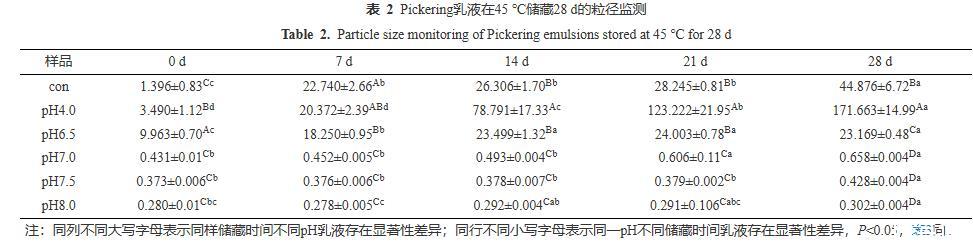 由图8可知,当储藏14 d时,Con、pH4.0的乳液均出现大面积的油滴聚集,pH6.5的乳液出现局部小聚集,而pH7.0~8.0的乳液微观结构显示其分布仍然均匀,无任何油滴聚集现象。当储藏28 d后,Con、pH4.0、pH6.5的乳液中聚集程度明显加强,pH7.0的乳液也有较微弱的局部小聚集现象;而pH7.5与pH8.0的乳液仍保持良好的分布状态,这与图7的视觉直观图、表2粒径监测和表3电位监测的结果保持一致。CLSM的结果再次证实PPP-NP稳定的乳液酸性条件下的长期稳定性较差,在中性和碱性条件下有着更好的乳液稳定性。这一结果与He等的结果相似,其所制备的样品同样在碱性条件下稳定性更高。