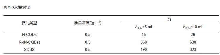 从表2可看出,R-(N-CQDs)的乳化性能远优于SDBS,分离出5 mL和10 mL水的时间接近SDBS的两倍。这是由于R-(N-CQDs)是纳米颗粒,吸附在界面膜附近可以大大增强界面膜的强度,从而增强了乳状液的稳定性。