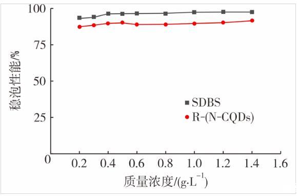 图8是稳泡性能测试结果。从图8可看出,R-(N-CQDs)的稳泡性能一直保持在95%以上,SDBS的稳泡性能一直处于90%与95%之间。这是因为R-(N-CQDs)本身结构的原因,碳量子点表面存在羟基、叔胺等亲水基团,同时,还存在很多疏水长碳链,这使得R-(N-CQDs)能够很好地吸附在气液两相界面(即液膜表面)上,在液膜表面形成纳米粒子保护层,一方面,增加了液膜强度;另一方面,减少了泡沫的歧化现象,大大增加了泡沫的稳定性。