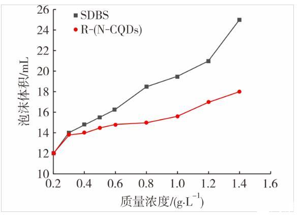 从图7可看出,R-(N-CQDs)的起泡能力表现不佳,虽然在高质量浓度下其起泡能力相比低质量浓度时有一定的提高,但是相对于SDBS的起泡能力仍存在较大的差距,这与R-(N-CQDs)自身结构有关,SDBS是直链结构,而R-(N-CQDs)结构上存在很多支链,形成泡沫时需要克服更多的表面能做功,所以形成的泡沫比SDBS更少。