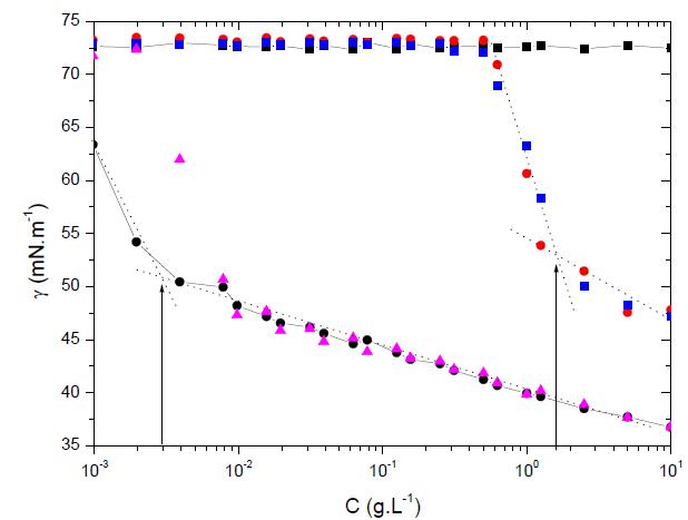 微流控技术是一种利用微米尺度管道及其它辅助手段对纳升、皮升级流体单元进行主、被动操纵的新兴技术。近年来,Karakasyan研究团队应用微液滴微流控技术制备出单分散响应型的聚醚胺-海藻酸盐共聚的微凝胶(Colloids and Surfaces B:Biointerfaces,2015,135,619–629),聚醚胺(PEA)与环氧丙烷/环氧乙烷(29/6)通过两种分子之间的胺键相连接枝共聚得到海藻酸盐接枝型的微凝胶。液滴微流控技术为海藻酸盐接枝微凝胶提供了精准的尺寸和物理化学性质控制,使得这些微凝胶与单独的海藻酸接枝链比,仍然保持有两亲型和热敏性等性质,应用表面张力测试技术研究微凝胶的表面化学性质,通过使用Delta-8高通量表面张力分析仪,采用Du Nouy-Padday法(最大拉力法)测试了不同浓度比例的组成聚醚胺-海藻酸盐共聚物化合物的表面张力,并自动将表面张力记录到系统中,由于Delta-8高通量XVDEVIOS破解版安卓手机安装包能够一次性测试96个样品,软件对测试的样品的数据能够进行自动分析,从而获得了聚醚胺-海藻酸盐共聚物的临界聚集浓度(CAC)以及临界胶束浓度(CMC)。(如下图1所示)。