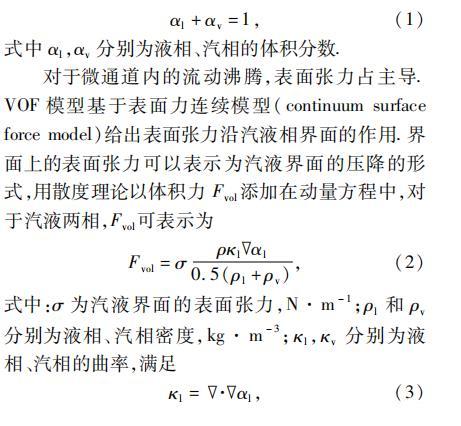 对于微通道内的流动沸腾,表面张力占主导。VOF模型基于表面力连续模型(continuum surface force model)给出表面张力沿汽液相界面的作用。界面上的表面张力可以表示为汽液界面的压降的形式,用散度理论以体积力Fvol添加在动量方程中,对于汽液两相,Fvol可表示为