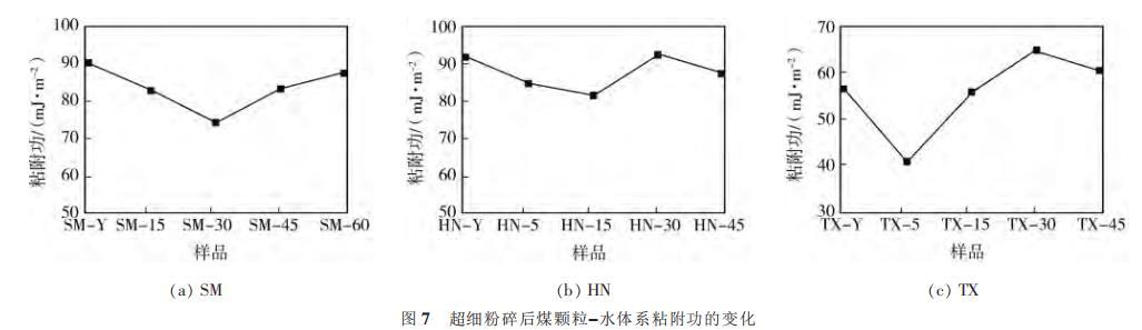 图7超细粉碎后煤颗粒-水体系粘附功的变化