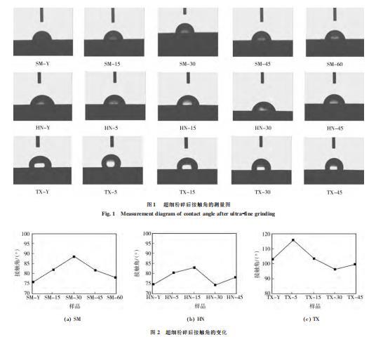 3种煤样超细粉碎后的接触角变化见图1、2。可以看出,变质程度高的太西煤的接触角在100°左右波动,明显大于神木不粘煤和淮南气煤的接触角(在75°左右变化)。还可以看出,湿法超细粉碎后3种变质程度煤样的接触角的变化规律相似,在短时间的湿法超细粉碎后,接触角变大,疏水性增强,随着超细粉碎时间的延长,接触角减小。总体来看,神木煤与淮南煤在湿法超细粉碎后的接触角大于超细粉碎前的,说明对于低阶煤,在湿法超细粉碎后,煤颗粒表面的疏水性在一定程度上有所增强,润湿性减弱;太西煤在湿法粉磨30、45min后的接触角小于超细粉碎前的,由此可得,对于高阶煤,长时间进行湿法超细磨矿会劣化煤颗粒表面的疏水性。