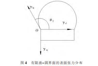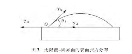 朱定一等通过设计一种在有限液-固界面上的润湿性表征体系,推导出在无限液-固界面系统中固相表面张力和液-固界面张力的计算方法,并且通过润湿角实验和计算,证实了在接触角较大时,该理论对固相表面张力的一致性。图3所示为液相在无限固体平面上的润湿表征系统。其中γsl、γlg、γsg分别表示固-液、液-气、固-气3个界面上的表面张力,O为气-液-固三相接触点,θ1为气-液界面的切线与固-液界面的夹角,即接触角。当达到平衡时,作用于润湿周边的3个表面张力在水平方向的分力必为0,此时的平衡状态方程,即Young方程为