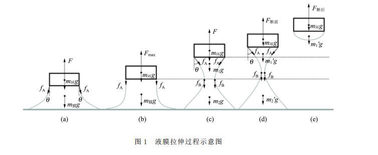 此时的液膜m1′将停留在吊环上,如图1(e)所示。所以拉断后,吊环所受拉力为吊环重力与残留液膜重力之和。