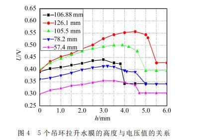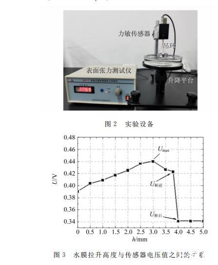图2是WBM-1A拉脱法液体表面张力实验仪,用来测定纯净水的表面张力系数。实验时采用标准吊环的内、外径分别为d1=33.10 mm,d2=34.96 mm,平均直径为d̄=34.03 mm,平均周长为πd̄=106.88 mm。该标准环拉出的水膜高度与力敏传感器电压读数之间的关系,如图3所示。可以看出,随着水膜高度的增加,吊环拉力逐渐增加到最大(图中Umax表示),然后慢慢减小,直至水膜断裂。图中U断前和U断后分别表示水膜断裂时和断裂后的瞬时电压值。吊环的受力变化情况与之前理论分析一致。