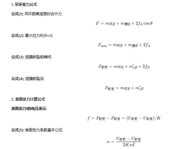 很显然,对比式(3)和(4),液膜断裂前、后的拉力之差为2fB,这正是液膜断裂点的表面张力,计算出的表面张力系数是准确的。同样,对比式(2)和(4),吊环拉力之差为2fA + (m膜 - m1′)g,此差值中除了有表面张力外,还包含一部分液膜重力,所以计算出的表面张力系数数值将明显偏大。因此文献中普遍采用液膜断裂点来计算表面张力系数。