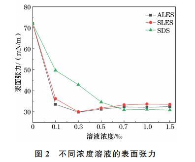 选取十二烷基聚氧乙烯醚硫酸铵(ALES)、十二烷基聚氧乙烯醚硫酸钠(SLES)和十二烷基硫酸钠(SDS)3种表面活性剂,进行表面张力的测试。测试过程中,通过调节芬兰Kibron公司生产的Delta-8全自动高通量XVDEVIOS破解版安卓手机安装包将铂环缓慢浸入溶液中,然后缓慢提起铂环,当铂环与液体样品分离时进行测量,并记录表面张力,每种溶液测量3次。每次测量前,用无离子水(IFW)清洗铂环并在酒精灯上干燥。