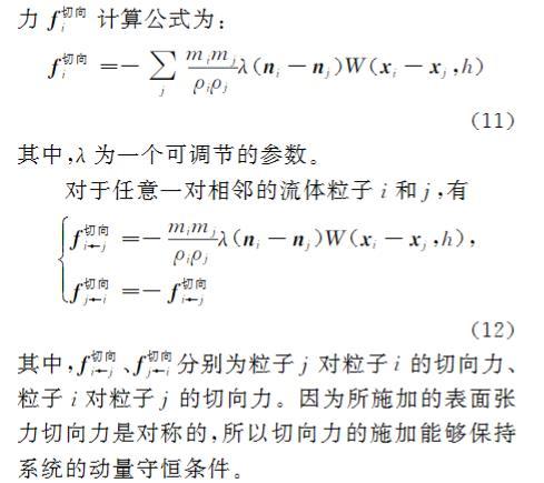 传统的流体表面张力的求解只是对色标函数求梯度,表面张力的方向就是色标函数的梯度方向,也就是说传统的流体表面张力的方向和表面法向相同;传统的流体表面张力模拟将表面的法向力作为表面张力,由于近似计算导致的计算误差使得流体表面张力的模拟很难到达自然界中的平滑状态,会出现凹凸不平,甚至尖角的模拟效果。本文在传统的CSF流体表面张力的基础上,考虑流体表面的法向力和切向力的综合作用,使得流体表面达到足够光滑。流体表面张力的切向力f切向i计算公式为:f切向i=-∑j mimj ρiρj λ( ni- nj) W( xi- xj, h) (11)其中,λ为一个可调节的参数。对于任意一对相邻的流体粒子i和j,有f切向i← j=- mimj ρiρj λ( ni- nj) W( xi- xj, h), f切向j← i=- f切向 i← j ì î í ïï ïï (12)其中,f切向i← j、f切向 j← i分别为粒子j对粒子i的切向力、粒子i对粒子j的切向力。因为所施加的表面张力切向力是对称的,所以切向力的施加能够保持系统的动量守恒条件。