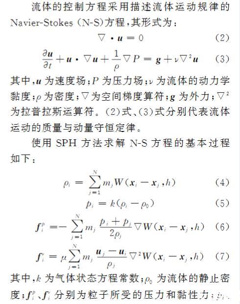 流体的控制方程采用描述流体运动规律的NavierGStokes(NGS)方程,其形式为:∇·u=0(2) ∂ u ∂ t+u·∇ u+1 ρ∇ P= g+ ν∇2 u(3)其中,u为速度场;P为压力场;ν为流体的动力学黏度;ρ为密度;∇为空间梯度算符;g为外力;∇2为拉普拉斯运算符。(2)式、(3)式分别代表流体运动的质量与动量守恒定律。使用SPH方法求解NGS方程的基本过程如下:ρi=∑ N j=1 mjW(xi-xj, h)(4) pi= k( ρi- ρ0)(5) f p i=-∑ N j=1 mj pi+ pj 2 ρj ∇ W(xi-xj, h)(6) f ν i= μ∑ N j=1 mj uj- ui ρj ∇2 W(xi-xj, h)(7)其中,k为气体状态方程常数;ρ0为流体的静止密度;f p i、f ν i分别为粒子所受的压力和黏性力;pi、pj分别为第i个、第j个粒子的压强;ui、 uj分别为第i个、第j个粒子的速度。