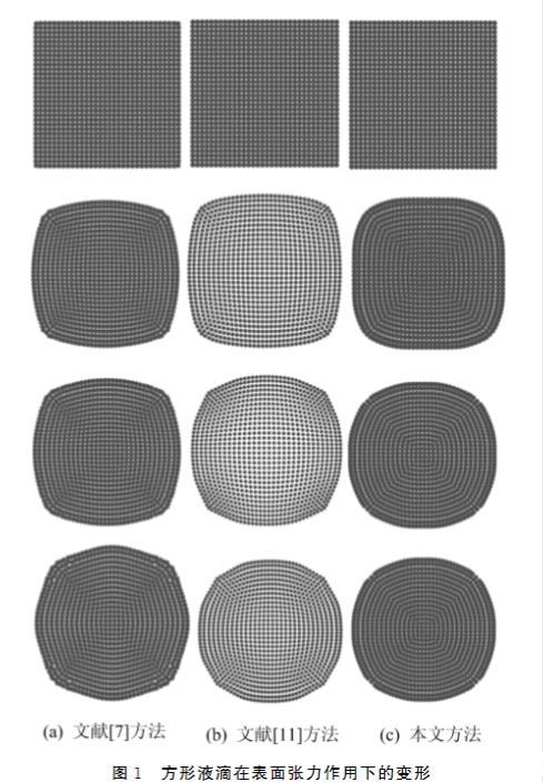 分别用文献方法、文献方法及本文方法模拟在表面张力作用下水珠的形成过程,对比它们的模拟效果,如图1所示。图1方形液滴在表面张力作用下的变形341第1期汪欢欢,等:改进的CSF流体表面张力模型实验在Window7平台上进行,采用Visual Studio2013。实验环境为Intel(R)Core(TM) i5G2400,3.10GHzCPU,4G内存,NVIDIA GeG forceGT620显卡,实验所采用的流体粒子数目为1024。模拟总帧数为500,文献方法、文献方法及本文方法分别用时9.12、9.87、9.34s。从实验结果可以看出,本文方法与文献方法、文献方法的模拟时间差异很小,但本文方法模拟的水珠达到稳定状态时表面更加圆滑,这说明本文方法可以更准确、有效地模拟流体表面张力。