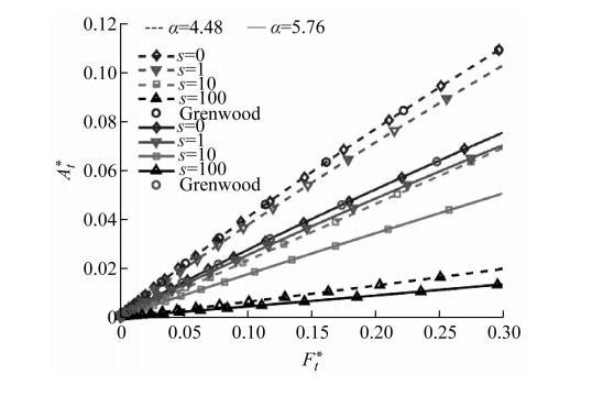 无量纲真实接触面积At*与无量纲两表面平均距离u的关系:两表面间平均距离越大,真实接触面积越小,且二者呈非线性关系。当两表面间平均距离不变时,表面张力越大,真实接触面积越小,这是由于表面张力的作用引起的。同理,当忽略表面张力时(s=0),其结果与Greenwood所得结果吻合。此外,当表面张力相同时,表面粗糙度较大时,真实接触面积较小。这里由于选取的两组表面形貌参数所对应的粗糙度相差不大,所以真实接触面积的差别很小。