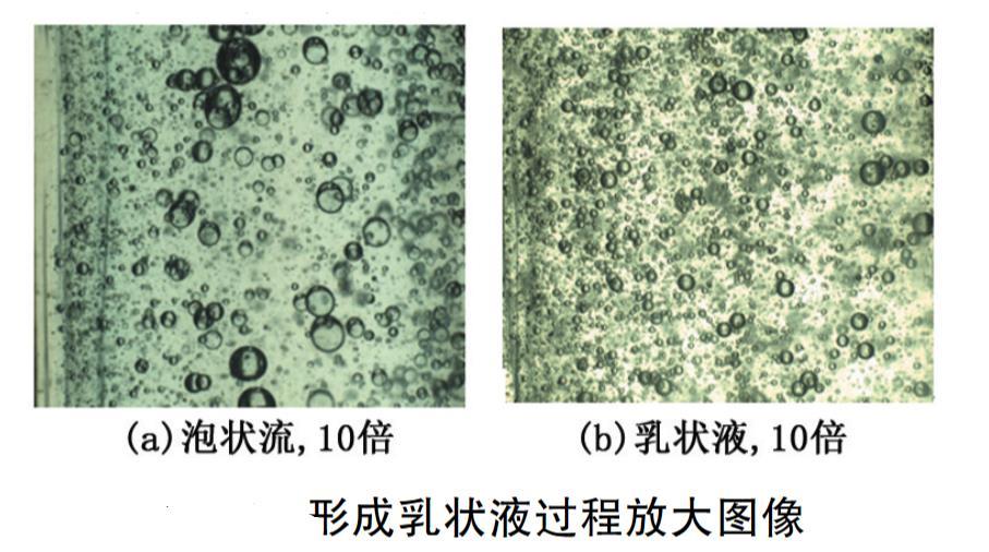 泡状流时,水相在连续的油相中形成一个一个的水泡,说明表面活性剂降低油水表面自由能,使水泡稳定且均匀的分散在油相中;形成水包油乳状液后,小油滴被水包裹,液滴尺寸明显降低,分散度增加,稳定的存在在连续相中。