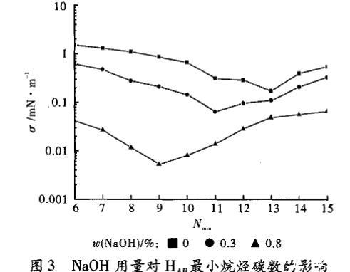 由图3可知,随着碱用量的增加,HAB溶液的Nmin值从13变为9,Nmin与EACN的比值从13/9变到1,即Nmin与EACN的比值更接近1,相应的界面张力也变得更低。对于混合表面活性剂体系来说,Nmin值虽然宏观上表现出一个值,而实质上是通过组成此混合表面活性剂体系中几种表面活性剂的Nmin值通过计算平均值得到的。实验中所用到的重烷基苯磺酸钠是一种混合表面活性剂,主要是由单烷基苯磺酸钠、二烷基苯磺酸钠、多烷基苯磺酸钠以及烷基萘磺酸钠等几种磺酸盐表面活性剂组成的,因此可以推断出,碱的加入改变了实验中表面活性剂HAB中每种表面活性剂的Nmin值,HAB溶液的Nmin值也就发生了变化,当碱的质量分数为0.8%时,HAB溶液的Nmin值变为9,如图1所示,HAB溶液与直馏柴油间的界面张力达到超低。