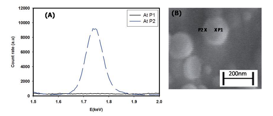 图1显示了核壳颗粒组装的SEM图像。这清楚地显示了直径为158±5 nm的球形颗粒(粒径的高斯分布在插图A中给出),具有暗芯和浅电晕(插图B)。典型的磁芯直径约为100 nm,电晕宽度约为40 nm。通过光散射实验确定了组件的直径。光散射数据分析得出的直径为100–200 nm,最大颗粒数的直径为161±10 nm,这与从SEM数据获得的尺寸一致(从DLS获得的颗粒尺寸的高斯分布在ESI†图S2中给出)。EDAX结果证实了粘土片在组件中的位置。图2(A)和(B)显示了给定结构在两个不同位置(xP1和xP2)的能量色散分布。它们清楚地显示了核心(xP1)内不存在硅(粘土结构中的主要元素之一),以及日冕(xP2)中硅的丰度。33,34这证实了粘土片被排除在这些结构的核心之外。因此,可以得出结论,核心是疏水的,主要含有姜黄素纳米颗粒(姜黄素不溶于水),而外壳(电晕)具有自组装血小板的倾向(LAPONITE®不溶于乙醇)。因此,XVDEVIOS官方下载免费版有一个结构,其中的核心是一个有机相(乙醇)周围的水晕。由于其溶解性偏好,姜黄素纳米颗粒和LAPONITE®血小板分别优先位于有机相和水相。