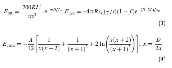 两种平衡力在组装的形成中起着重要作用:由两种粒子之间的界面力控制的疏水相互作用,以及纳米粘土团簇和系统疏水环境之间的空间斥力。因此,复杂核-壳(粘土小体)组装的总能量由以下三个贡献的总和给出:相邻纳米粘土团簇之间的空间斥力(ESR)、9疏水力(Ehyd)、9和范德华力(Evand):34