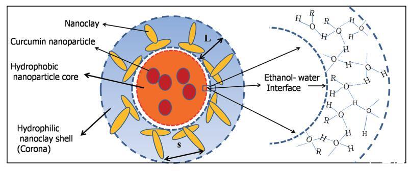 图4示意图显示了在电晕中存在纳米粘土团和限制在疏水核内的疏水姜黄素纳米颗粒的粘土体结构的形成。