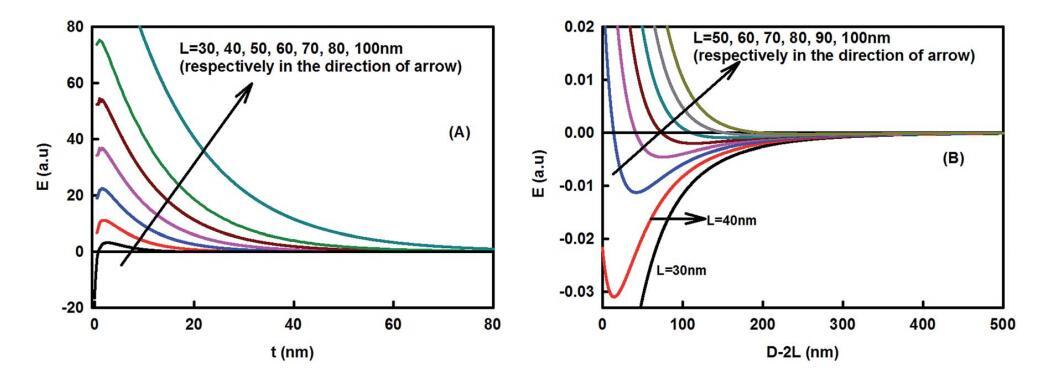 疏水核(有机)和亲水壳(水)之间的界面区域对稳定组装的形成起着重要作用。它维持排斥能屏障,抵抗核心内存在的吸引疏水能。屏障抑制姜黄素纳米颗粒的聚集,并支持所形成的粘土小体组装(或核壳纳米颗粒)的稳定性。该势垒对电晕中纳米粘土团簇的尺寸高度敏感。图5(A)和6(A)显示了总能量随界面区域厚度的变化。势垒高度随纳米粘土团簇长度的增加而增加,随足迹直径的减小而减小。当L>80nm和s<30nm时,它变得高度排斥。