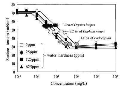 图8水硬度对肥皂表面张力曲线的影响以及3种水生物种的有毒表面张力值。