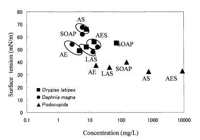 图2显示了五种不同表面活性剂(LAS、AE8、AES、AS和SOAP)的γtox和水生毒性值之间的关系。 野生稻的γtox值与大型水蚤相近。 LAS、AE8、AES-AS和SOAP的γtox值分别为50、50、50、65-70和60mn/m。 另一方面,所有五种表面活性剂的podocopida的γtox值均低于40 mN/m。