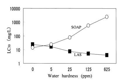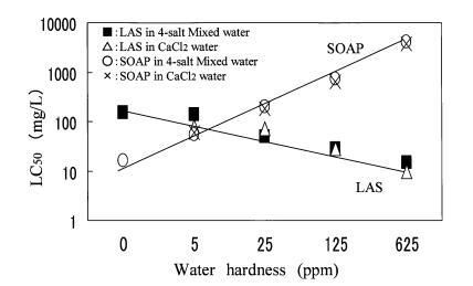 在预试验中,大型水蚤在4盐混合溶液中存活,但在CaCl2?H2O溶液或蒸馏水中不能存活。 另一方面,角鲨在所有3种水中都能存活。 因此,使用podocopida研究了水硬度成分对LAS和肥皂毒性的影响。 如图3所示,CaCl2?H2O溶液和4-盐混合溶液的毒性值没有差异。 肥皂的毒性随水硬度的增加而降低,LAS的毒性随水硬度的增加而增加。