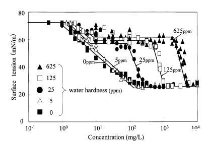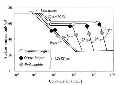 图9水硬度对烷基硫酸盐表面张力曲线的影响以及对大型水蚤的有毒表面张力值。