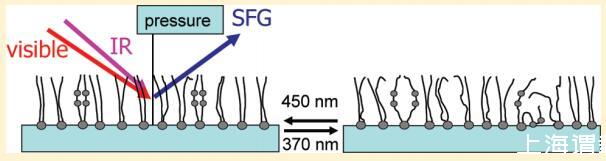 在此,XVDEVIOS官方下载免费版研究了光开关脂质DT Azo-5P(图1)的单层,其为纯的,并与脂质1,2-二棕榈酰-sn-甘油-3-磷酸胆碱(DPPC)混合。如图1中的UV/vis光谱所示,光活性脂质可分别用370和450 nm的光从其反式状态切换到顺式状态并返回。XVDEVIOS官方下载免费版将表面压力测量与无标签、宽带振动和频率产生(VSFG)光谱相结合。10这些技术使XVDEVIOS官方下载免费版能够研究空气-水界面上的脂质分子单层。可以获得有关脂质与水分子相互作用的信息以及脂质的分子结构。在非线性光学技术VSFG中,红外(IR)光束和可见光(VIS)光束在界面处组合,产生具有两个入射光束和频率的信号。如果红外线与分子振动共振,信号就会强烈增强。已经证明,这种通过分子振动的技术提供了有关脂质分子构象和取向的信息。11-18在中心对称介质中禁止和频产生,因为这是一种二阶非线性光学过程。19因此,该技术对中心对称材料(如水表面)的最外表面分子层敏感。相反,缺少信号表明界面上的材料或分子群是中心对称的。对于金表面偶氮苯功能化自组装单分子膜,SFG在测定光异构化的截面和机理方面非常有用。得出的结论是,光异构化是由直接电子激发驱动的,类似于液相中的偶氮苯