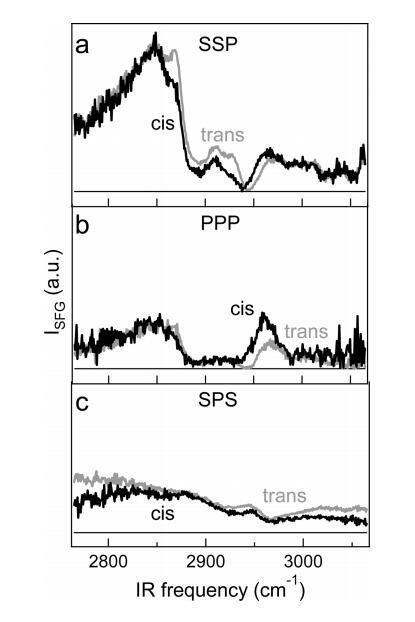 图5.(a)在P的反式和顺式状态下,每分子65Å2面积的DT Azo-5P纯单层的标准化VSFG光谱与SSP极化分别为6和20 mN/m。(b)与a部分类似,但对于PPP极化。(c)反式和顺式状态的SPS极化中的SFG光谱( ∼ 每分子78Å2),压力为2和15 mN/m。三个面板具有相同的垂直刻度。