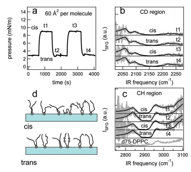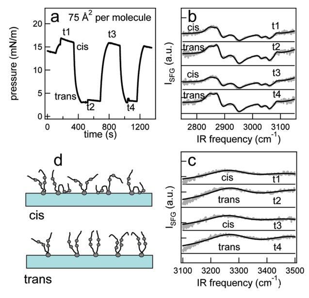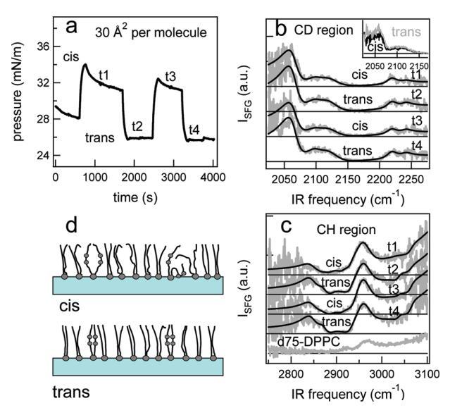 图6。在脂质/H2O界面处,DT Azo-5P/d75 DPPC的1:5混合物的结果,每个分子的面积为60Å2。(a) 表面压力与时间的关系。用370和450 nm光照射∼100秒分别产生顺式(高压)和反式(低压)状态。压力的微小剧烈波动是由于样品高度的变化,以校正水的蒸发。(b) 相应的VSFG光谱(灰色)以及CD区域的拟合。为了清晰起见,光谱已被抵消。(c) VSFG光谱(灰色)以及用于引导眼睛进入CH区域的拟合。底部曲线显示了在P时纯d75 DPPC的光谱∼ 40百万/米。(d) 脂质尾部方向的示意图。光开关脂质的偶氮苯部分用灰色圆圈表示。