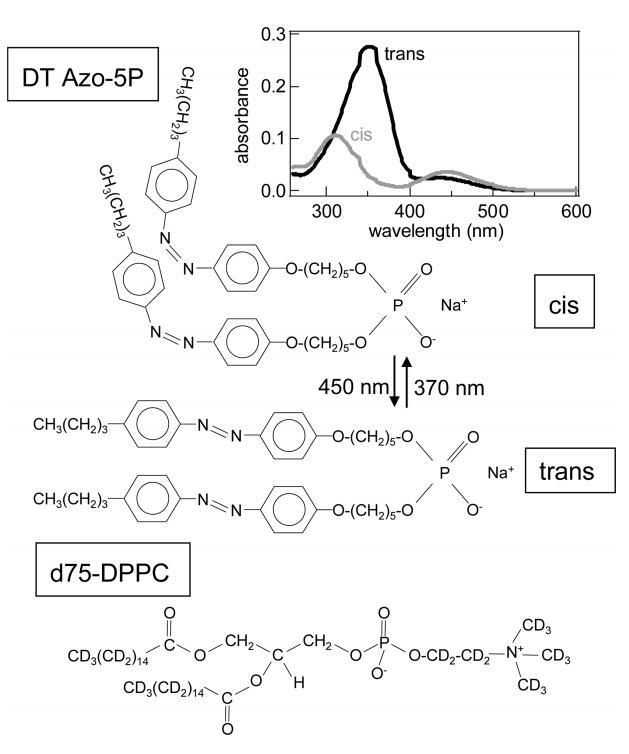 图1。 顺式和反式构型的光开关脂质DT Azo-5P和d75 DPPC的分子结构。 右上角的插图显示了CHCl3中DT Azo-5P的紫外/可见光谱( ∼ 在370nm(顺式状态)和450nm(反式状态)下辐照约10s后,使用7μM,1cm的反应杯。