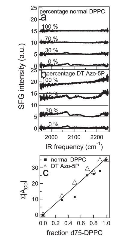 图9。 (a) 正常DPPC和d75 DPPC不同混合物的CD区VSFG光谱。 图中给出了混合物中正常DPPC的百分比。 为清晰起见,光谱偏移,细线表示零。 (b) 与a部分类似,但适用于DT Azo-5P与d75 DPPC的混合物。 (c) 通过拟合文中描述的VSFG光谱获得的CD振动振幅之和,作为含正常DPPC或DT Azo-5P的二元混合物中分数d75 DPPC的函数。 在本实验中,为了获得混合物的高质量数据,IR通量很高,导致通过VSFG光谱中相对较高的CH2和CD2振幅观察到的脂质尾部出现小的无序。