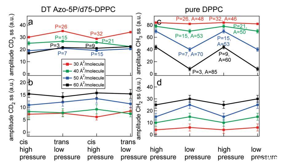 图8.在d75 DPPC和DT Azo-5P(左)的5:1比率的实验中,d75 DPPC和纯正常DPPC(右)的拟合结果。(a)CD3对称拉伸振动模式的振幅作为不同密度的光开关脂质状态的函数;(b)CD2对称拉伸振动模式的振幅作为不同密度的光开关脂质状态的函数;右图显示了纯DPPC的类似结果,压力与左图相似,其中(c)CH3对称拉伸振动模式的振幅和(d)CH2对称拉伸模式的振幅。共振的宽度和频率在拟合中是固定的。
