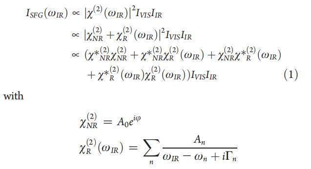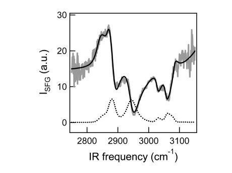 图3。密度为75Å2/分子,压力为∼300万/米。共振信号叠加在一个大的非共振背景上,由于共振信号和非共振信号之间的干扰,产生色散线型。黑色虚线曲线表示NR振幅设置为零时的DT Azo-5P信号。