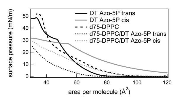 图2。反式和顺式状态下的光开关脂质DT Azo-5P(实线)、d75-DPPC(虚线)以及光开关两种状态下的1:5摩尔比的光开关脂质和d75-DPPC(虚线)的表面压力与面积等温线。