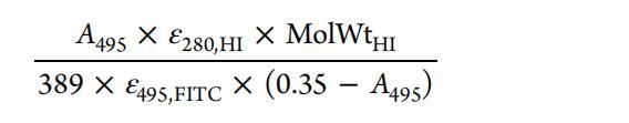 荧光光谱法用于选择含有FITC-HI的小份样品。 FITC探针在494nm激发时显示出517nm的发射。 人们注意到,当探针与HI共轭时,FITC发射的强度增加。 吸收光谱法用于确定HI与FITC的比率,该比率由下式计算得出。21