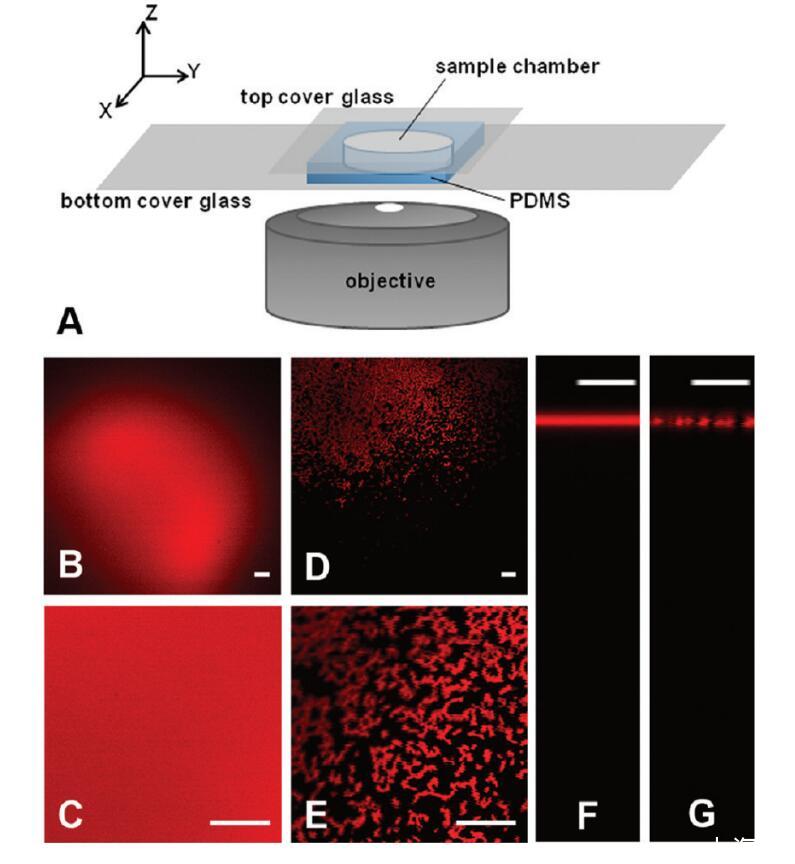 图1。(A)样品室和倒置显微镜设置。(B-G)在AWI条件下,pH 7.2,离子强度=193 mM的PBS中HSA-TR的共焦图像。(B,C)HSA-TR(0.050 mg/mL)或(D,E)HSA-TR(0.025 mg/mL)的XY平面图像。图像C和E使用4倍光学变焦。穿过(F)HSA-TR(0.050 mg/mL)或(G)HSA-TR(0.025 mg/mL)AWI的XZ平面图像。比例尺:20μm。