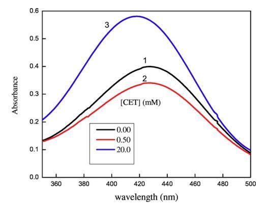 图5.[CET]对水性甲酚红染料可见光谱的影响:(1)[CET]=0mm,(2)[CET]=0.50mm,(3)[CET]=20mm。[CR]=3×10−5毫米。