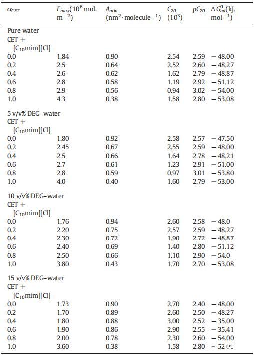 表4纯CET、[C10min][Cl]和CET+[C10min][Cl]混合物的表面过剩(Γmax)、每分子最小面积(Amin)、吸附效率(pC20)和吸附自由能(ΔGad 0),作为纯水中CET摩尔分数α的函数,并且在T=298.15K时存在不同体积百分比的二元DEG-水混合物。