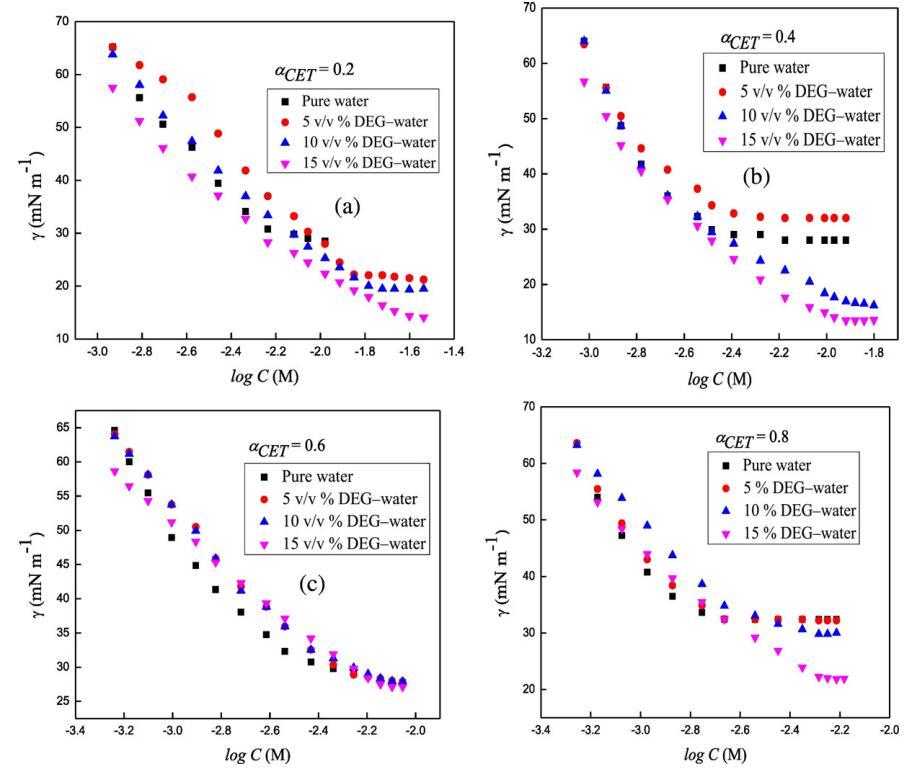 图2.在T=298.15 K时,二甘醇-水二元混合物的不同体积百分比下,混合体系的表面张力,γ与对数[浓度]的关系曲线,CET+[C10min][Cl](a)αCET=0.2(b)αCET=0.4,(c)αCET=0.6和(d)αCET=0.8。