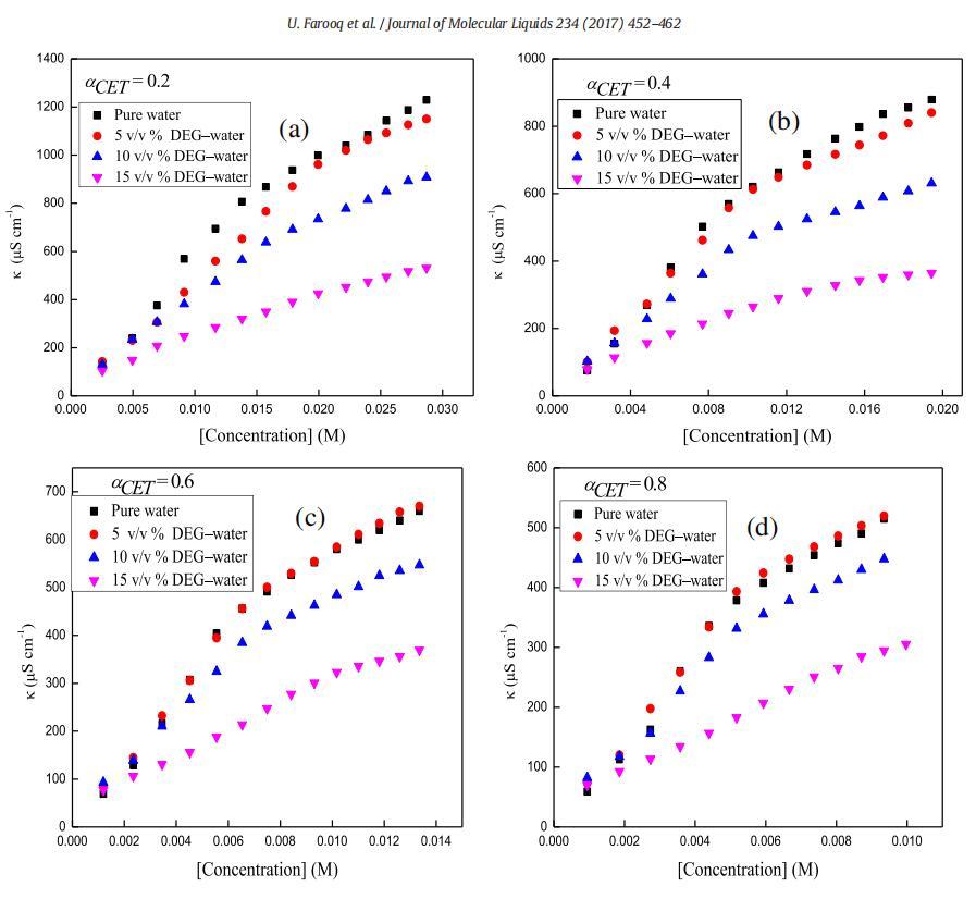 图1。在T=298.15 K时,二甘醇-水二元混合物的不同体积百分比下,混合体系的比电导率,κ与[浓度]的曲线图,CET+[C10min][Cl](a)αCET=0.2(b)αCET=0.4(c)αCET=0.6和(d)αCET=0.8。