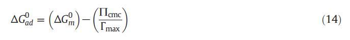 式(14)中的术语ð∏cmcΓmaxÞ为XVDEVIOS官方下载免费版提供了将单层表面压力为零的两亲分子引入胶束所需的工作信息。ΔGm0和ΔGad 0的值均为负值,表明这两个过程都是有利的,但是ΔGad 0的值比ΔGm0的值更为负,这表明所有这些系统的吸附过程比胶束形成过程更为有利。