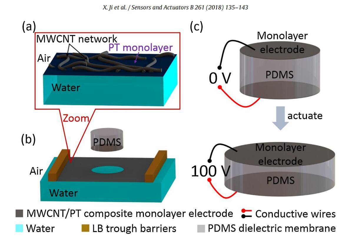 图1。使用Langmuir-Schaefer转移单层电极制作低压DEA(a)在空气-水界面形成的单层复合电极:嵌入聚(烷基噻吩)(PT)单层内的互连MWCNT网络。(b)Langmuir-Schaefer(LS)将复合单分子膜从空气-水界面转移到PDMS介电膜上,制成DEA的一个电极。(c)DEA由一层1.4μm厚的硅酮膜组成,硅酮膜夹在两个亚100 nm厚的复合单层电极之间。