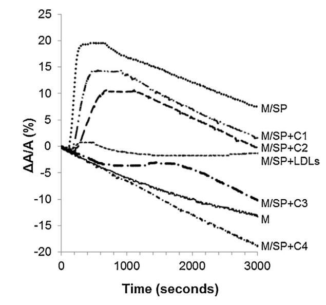 图5。注入(…)后,由单层(M)覆盖并在不含(-)额外分子的缓冲液上形成的界面的相对表面积随时间的变化SP(26.6±1.5 mg蛋白质)、SP(26.6±1.5 mg蛋白质)和不同浓度(··-)C1、(·-)C2的脂质体的混合物,(·-)C3和(·-)C4(分别为1.17±0.02 mg、2.18±0.02 mg、4.37±0.02 mg和6.55±0.02 mg脂质)和(---)LDL(4.6 mg PC)和SP(26.6±1.5 mg蛋白质)的混合物。空气-缓冲界面处的温度为34℃。表面压力保持在25 mN/m。