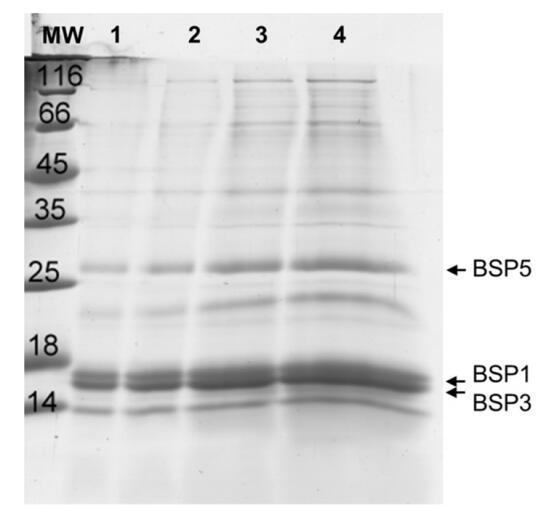 图1。从牛射精中分离并以不同浓度沉积的精浆SDS-PAGE凝胶:lane 1:1μg;泳道2:2μg;泳道3:5μg和泳道4:10μg。