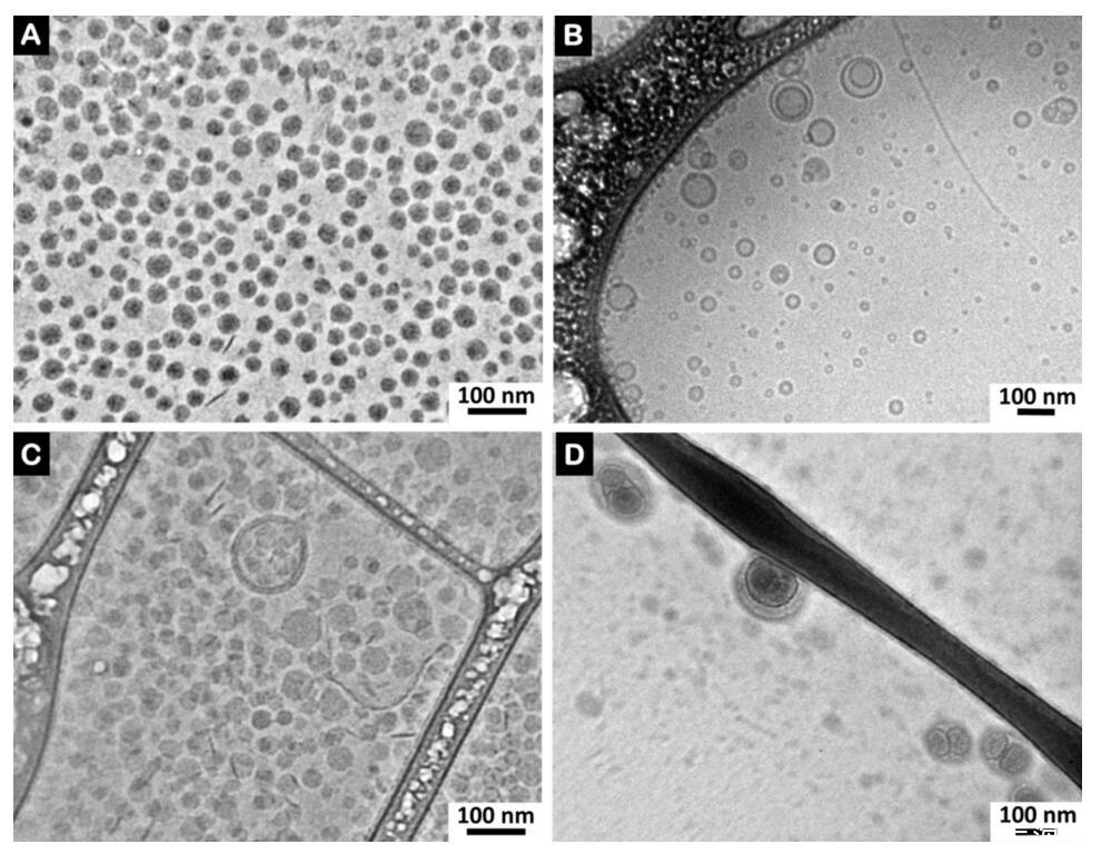 图7。(A)低密度脂蛋白,(B)脂质体,(C)低密度脂蛋白和精浆(精浆中的比例为0.17 mg PC/mg BSP蛋白质)和(D)脂质体和精浆(精浆中的比例为0.16 mg PC脂质体/mg BSP蛋白质)的冷冻电镜图像。