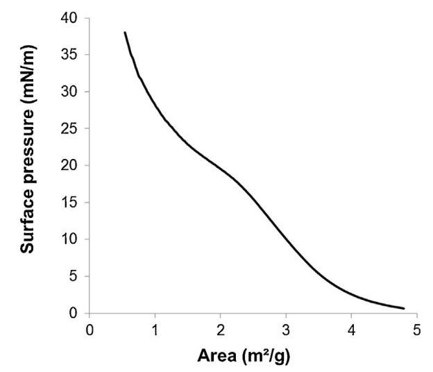 图3。通过传播精浆在空气/缓冲液界面形成的单层的表面压力面积(π–A)等温线(n=3,标准偏差在0-18.9 mN/m范围内不超过1.5 mN/m,在18.9-38 mN/m范围内不超过1.2 mN/m)。