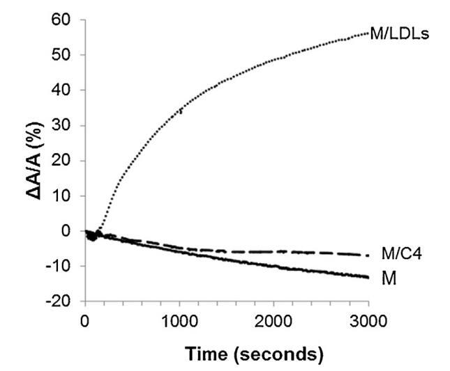 图4。单层(M)所覆盖的界面的相对表面积随时间的变化,该单层(M)以25 mN/M的速度压缩,并在不含任何额外分子(-)的缓冲液上形成,(…)LDL(4.6 mg PC)和(-)脂质体C4(含4.8 mg PC)。空气-缓冲界面处的温度为34℃。