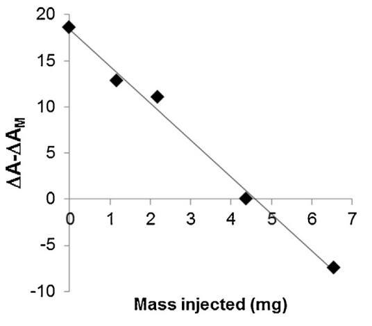 脂质体(不同浓度)对BSP蛋白的作用也如图5所示。脂质体在进入亚阶段前与精浆接触。随着脂质体中浓度的增加(曲线M/SP+C1至C4),BSP蛋白吸附引起的表面积增加逐渐延迟并减少。当含量达到4.37 mg(C3)时,界面上仍有少量BSP蛋白掺入,1600 s时出现肩部。在最高浓度(C4)下,未观察到BSP蛋白掺入,分子面积的变化甚至比对照曲线更负,表明膜组分在亚相中轻微溶解。因此,脂质体作用于BSP蛋白的方式与LDL相同。最有趣的比例似乎介于C3和C4之间。根据确定面积变化与脂质体注射磷脂质量之间相互作用的曲线计算得出(图6)。注射26.6 mg BSP的最佳质量为4.6 mg,即PC:BSP比为0.16(w/w)。