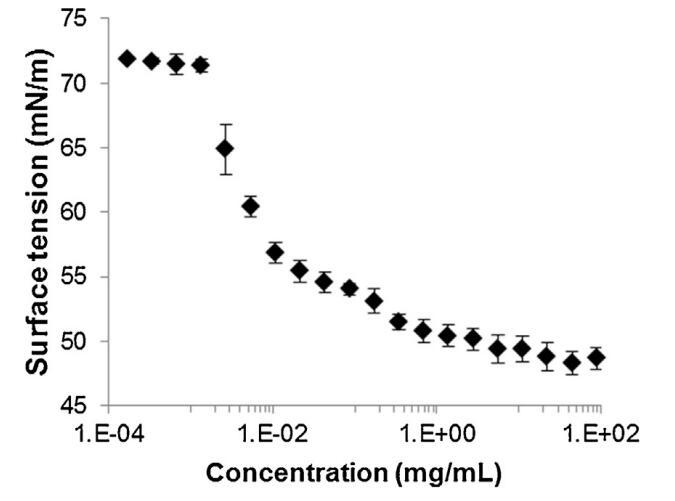 图2。牛精浆溶液在空气-水界面处的表面张力(±标准偏差),与提取物中所含蛋白质的浓度有关,并以对数标度表示(T=23.2℃±0.3℃,n=2,每个样品重复4次)。